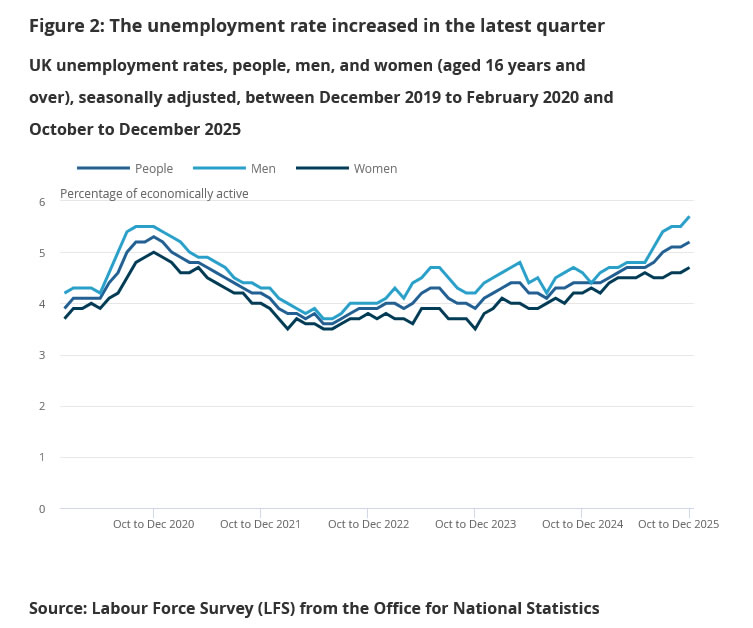 In the three months to December, the unemployment rate increased from 5.1% to 5.2% — the highest level since 2020. Wage growth showed signs of moderation. Average earnings including bonus slowed to 4.2% yoy from 4.6%, undershooting expectations of 4.6%. Earnings excluding bonus eased to 4.2% yoy from 4.4%, in line with forecasts.