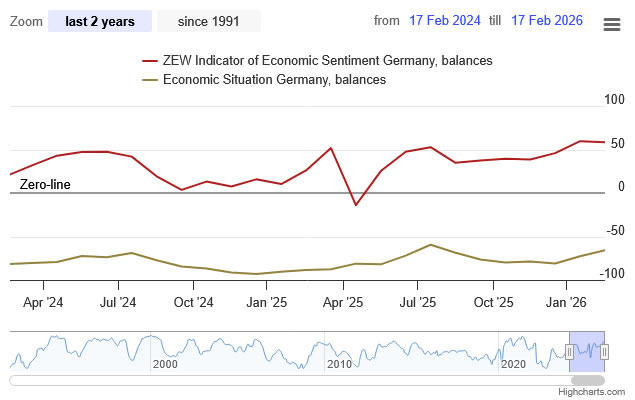 Sector breakdown showed moderate to strong improvement in export-oriented industries, including chemicals and pharmaceuticals, steel and metals, and mechanical engineering, likely reflecting stronger incoming orders late last year. Private consumption prospects also improved, while banks, insurers, and IT sectors reported weaker expectations.