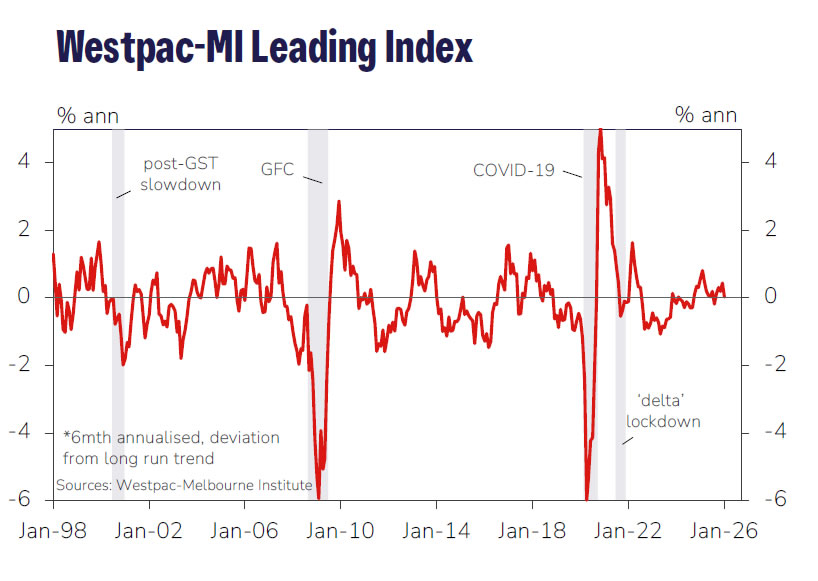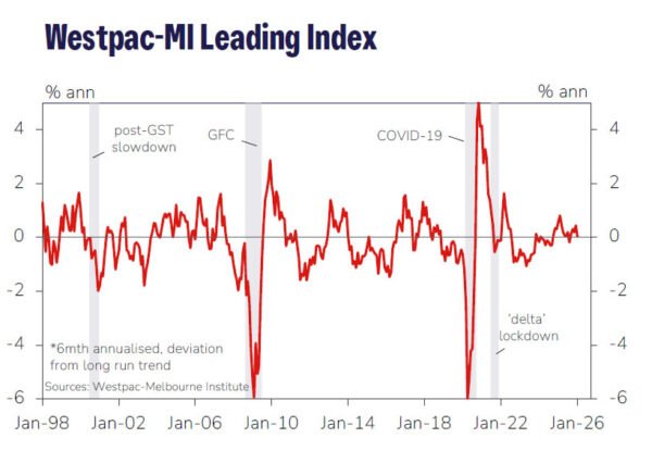 The bank warned that with growth stalling again and further rate increases still possible, 2026 may shape up as another “on again, off again” year for the economy. Even so, Westpac continues to expect GDP growth of around 2.5% this year — broadly in line with trend and consistent with the Leading Index signal.