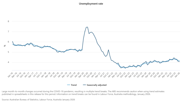 Australia added 17.8k jobs in January, slightly below expectations of 20.3k, but the details were firm. Full-time employment rose a strong 50.5k, while part-time positions fell -32.7k. Unemployment rate held steady at 4.1%, undershooting forecasts for a rise to 4.2%, with participation unchanged at 66.7%. Monthly hours worked increased 0.6% mom, reinforcing signs of steady labor demand.