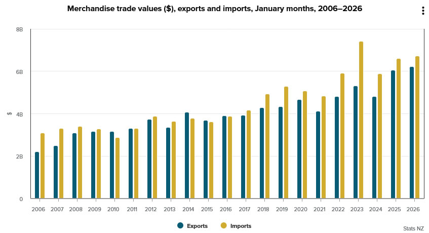New Zealand’s goods exports rose 2.6% yoy in January to NZD 6.2B, up NZD 157m from a year earlier. Goods imports increased 1.9% yoy to NZD 6.7B, up NZD 126m. The result was a monthly trade deficit of NZD -519m.