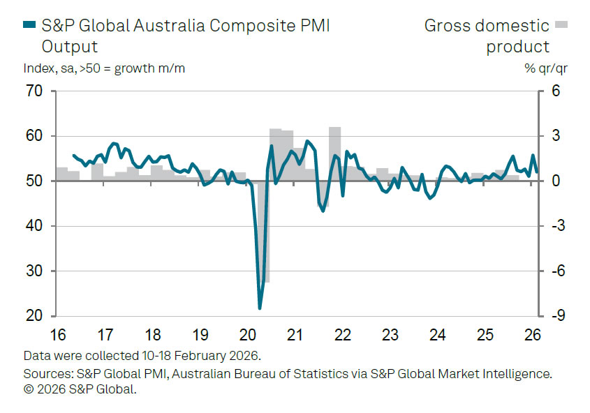 Australia’s February flash PMIs signaled a slowdown in private sector momentum. PMI Manufacturing slipped from 52.3 to 51.5, while PMI Services dropped sharply from 56.3 to 52.2. As a result, PMI Composite fell from 55.7 to 52.0, indicating growth continued but at a much more modest pace.