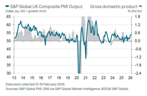 According to S&P Global’s Chris Williamson, the data point to an “encouraging start” to the year. Output growth across both manufacturing and services has accelerated in January and February. Current readings are consistent with GDP rising just over 0.3% in the first quarter if momentum carries through March.