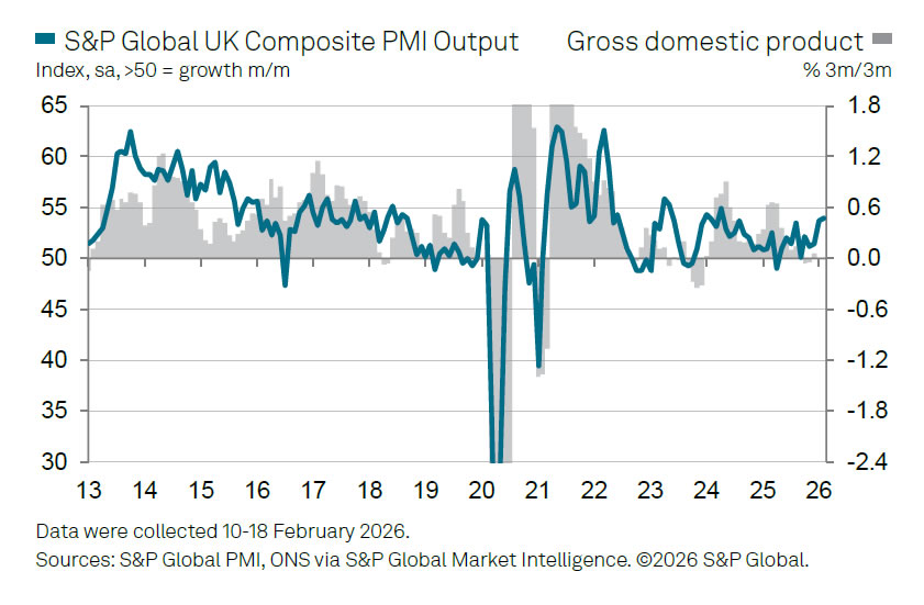 UK business activity continued to expand in February, with PMI Manufacturing rising from 51.8 to 52.0, marking an 18-month high. PMI Services edged slightly lower from 54.0 to 53.9. PMI Composite improved from 53.7 to 53.9, reaching its strongest level in 22 months.
