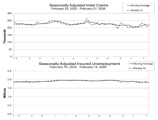 Continuing claims fell -31k to 1,833k in the week ending February 14. Four-week moving average of continuing claims rose 3.5k to 1,848k.
