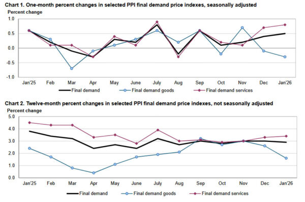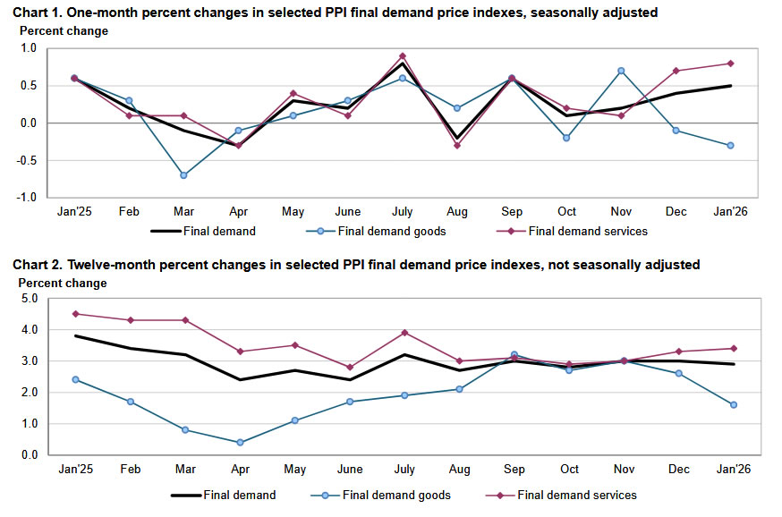 US producer prices rose more than expected in January, with headline PPI climbing 0.5% mom against forecasts of 0.3%. The increase was largely driven by a sharp 0.8% gain in final demand services, while prices for final demand goods declined -0.3%.