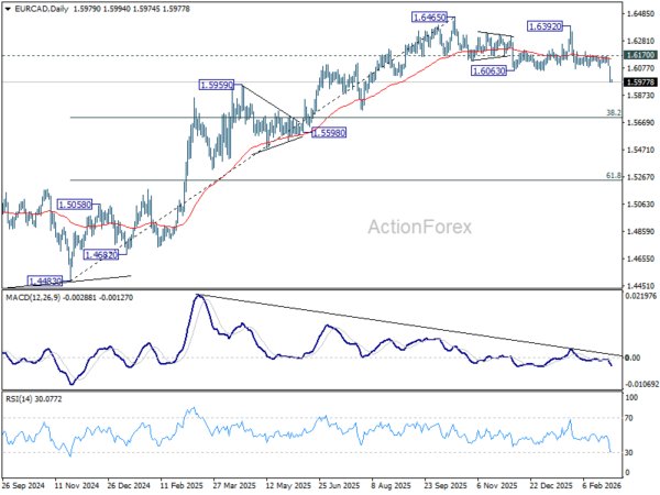 EUR/CAD is among the bigger movers this week, with Loonie being lifted by surging oil prices. Technically, fall from 1.6465 medium term top resumed by powering through 1.6063 support. Near term outlook will stay bearish as long as 1.6170 resistance holds.