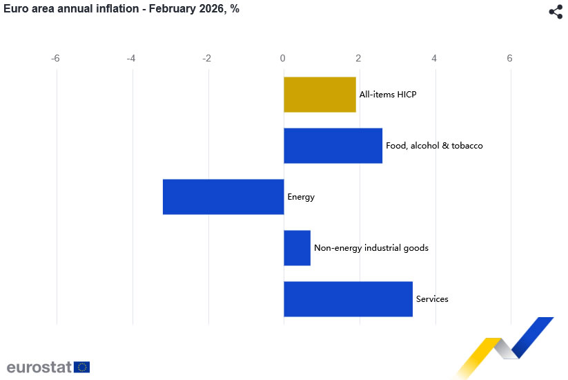 Food, alcohol and tobacco held steady at 2.6%, while non-energy industrial goods picked up to 0.7% from 0.4%. Energy prices remained negative at -3.2%, though the drag eased compared to -4.0% in January.