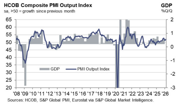 Among the major economies, Germany led the expansion with a composite reading of 53.2, marking a four-month high. Italy followed with a reading of 52.1, while Spain registered 51.5 despite slipping to a nine-month low. Ireland also remained in expansion territory at 52.5. France remained the weakest performer, however, with a composite reading of 49.9, still slightly below the 50 threshold separating expansion from contraction.