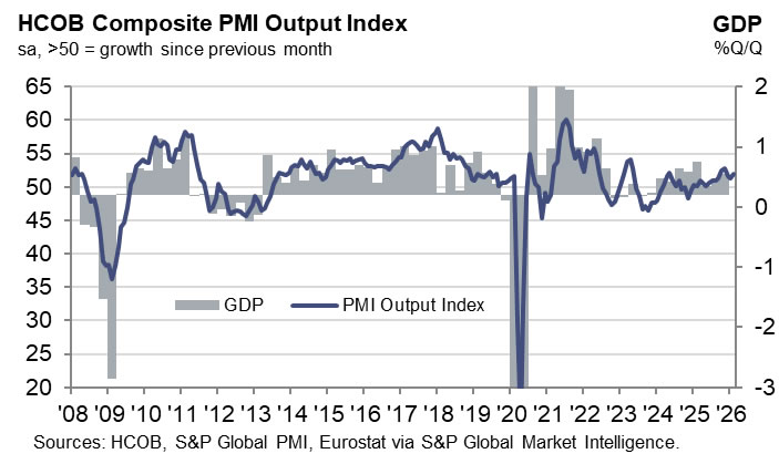 Among the major economies, Germany led the expansion with a composite reading of 53.2, marking a four-month high. Italy followed with a reading of 52.1, while Spain registered 51.5 despite slipping to a nine-month low. Ireland also remained in expansion territory at 52.5. France remained the weakest performer, however, with a composite reading of 49.9, still slightly below the 50 threshold separating expansion from contraction.