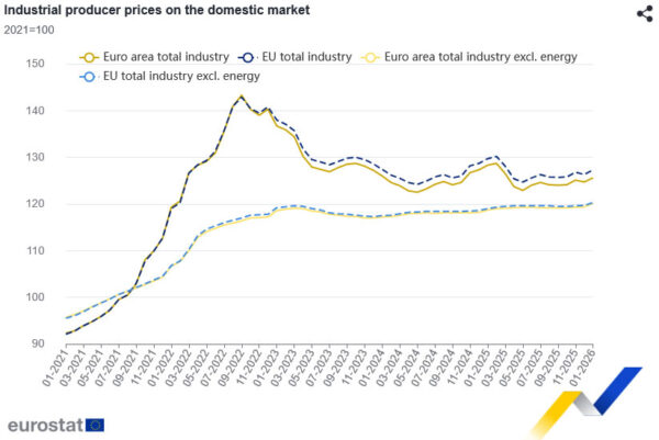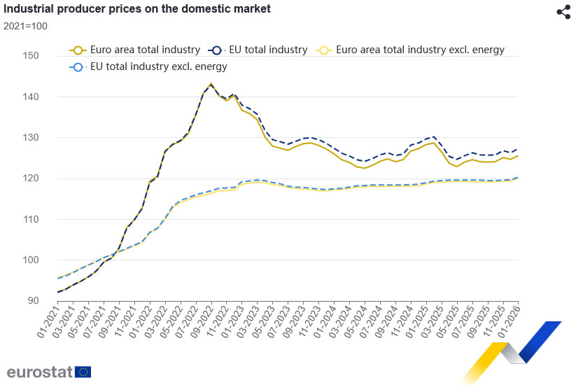 Eurozone industrial producer prices rose sharply in January, signaling renewed upstream inflation pressures. According to data from Eurostat, PPI increased 0.7% mom, significantly above expectations of a 0.2% rise.