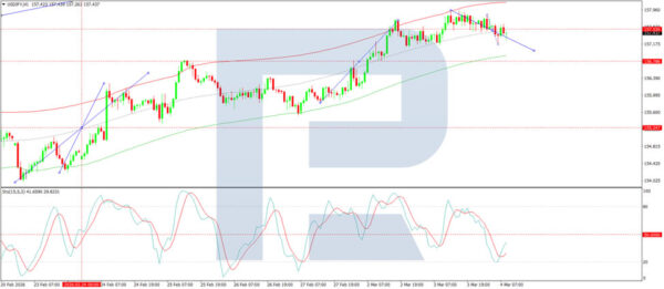On the H1 chart, USD/JPY is forming a downward wave pattern, targeting the 157.00 level, with a possible extension to 156.66, and further growth towards 158.38 anticipated thereafter. Technically, this scenario is confirmed by the Stochastic oscillator, with its signal line above the 20 level and pointing firmly downward.