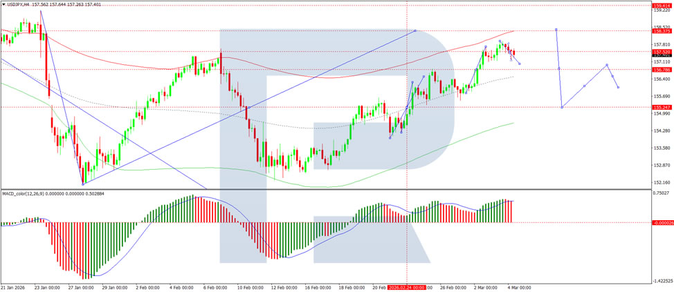 On the H4 USD/JPY chart, the market is forming a consolidation range around 157.00, which is currently extending to 157.92. A decline to test the 157.00 level from above is expected today. Following this, a potential growth leg towards 158.06 is likely. Technically, this scenario is supported by the MACD indicator, whose signal line is well above the zero line and pointing firmly downward.
