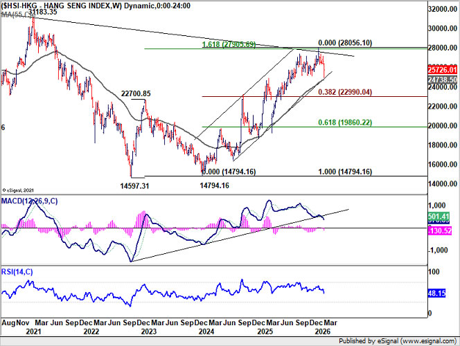 The index is currently attempting to hold support around the rising channel floor and the 55 W EMA near 24,738. However, decisive break below that region could open the way for a pullback to 38.2% retracement of 14,7946 to 28,056 at 22,990 at least.