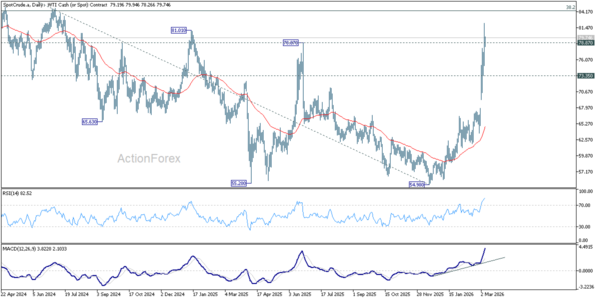 If that interpretation holds, attention now turns to the next major technical level of 38.2% retracement of 131.82 to 54.98 at 84.33. A decisive break above that level would strengthen the case that crude has entered a broader up trend rather than simply experiencing a war-driven spike.