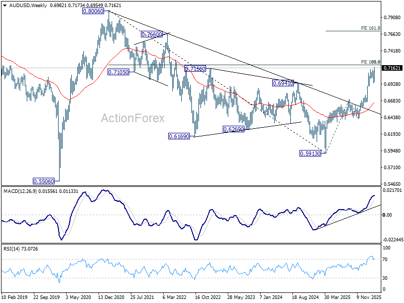 Technically, AUD/USD’s up trend from 0.5913 (2025 low) resumed today and it will soon be testing a key cluster resistance zone at around 0.72. That zone includes 100% projection of 0.5913 to 0.6706 from 0.6420 at 0.7213, and 61.8% retracement of 0.8006 (2021 high) to 0.5913 at 0.7206. Decisive break there would pave the way to 161.8% projection at 0.7703 or even further to 0.8006 high.