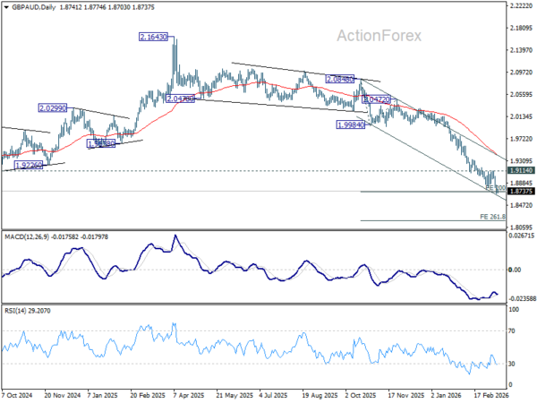 Meanwhile, GBP/AUD has continued its decline and has already reached 200% projection of 2.0848 to 1.9984 from 2.0472 at 1.8744. While the cross may attempt a temporary rebound from the falling channel floor, the broader outlook remains bearish. As long as resistance at 1.9114 caps any recovery, the downtrend is likely to continue toward 261.8% projection at 1.8210.
