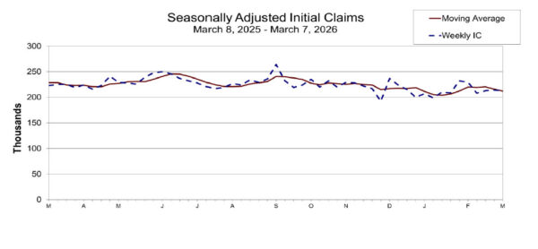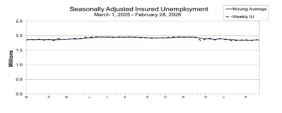 Continuing claims fell -21k to 1,850k in the week ending February 28. Four-week moving average of continuing claims fell -500 to 1,852k.