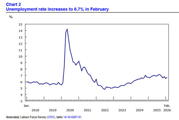 Canada’s labor market suffered a sharp setback in February, with employment plunging by -83.9k, far worse than expectations for a modest gain of around 10k. The decline marks a significant deterioration in labor conditions.
