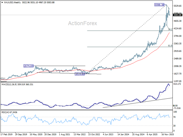Looking further ahead, Gold is seen as correcting the broader uptrend that began from 2022 low at 1614.60. Deeper fall is likely to 4,000 region, which is slightly below 38.2% retracement of 1,614.60 to 5,598.38 at 4,076.57, or a bit lower to 55 W EMA (now at 4,005.22)