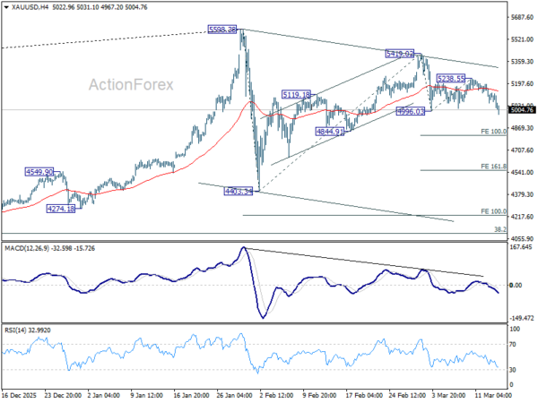 The break below 4996.03 support today signals that this decline has resumed. The next target at 100% projection of 5,419.02 to 4,996.03 from 5,238.55 at 4,815.55. This level is the key near-term focus for traders. Firm break there would prompt downward acceleration to 161.8% projection at 4,554.13.