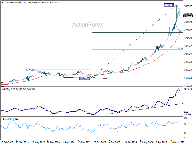 Looking further ahead, Gold is seen as correcting the broader uptrend that began from 2022 low at 1614.60. Deeper fall is likely to 4,000 region, which is slightly below 38.2% retracement of 1,614.60 to 5,598.38 at 4,076.57, or a bit lower to 55 W EMA (now at 4,005.22)