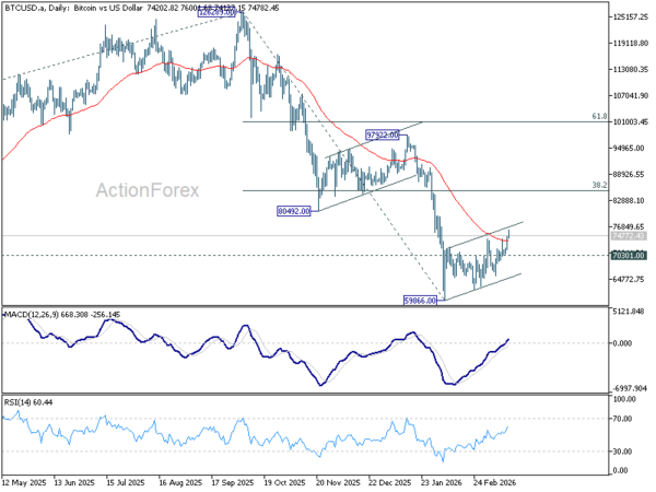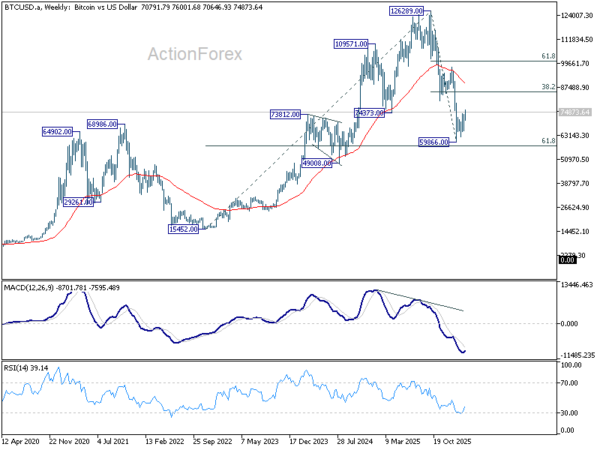 However, the upside may remain capped in the near term. Strong resistance is expected in the 80,000–85,000 zone, where the psychological barrier aligns with the 38.2% retracement of 126,289 to 59,866 at 85,239. Failure to sustain gains above current levels, particularly a break below 70,000, would signal that the rebound has run its course and shift focus back toward the 59,866 low.