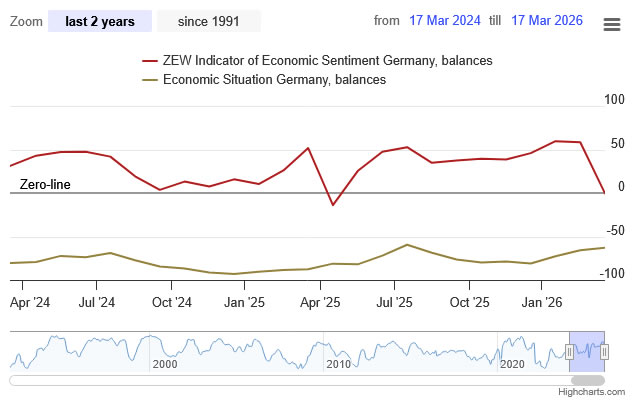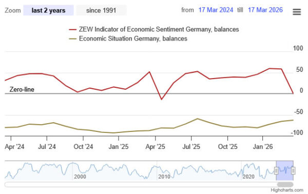 The primary driver is the escalation in Middle East conflict, which has pushed energy prices sharply higher and revived inflation concerns across Europe. ZEW President Achim Wambach warned that the surge in energy costs is increasing inflationary pressure and raising the risk that Germany’s nascent recovery could stall. “The financial market experts are sceptical that a quick resolution of the conflict will take place,” he added.