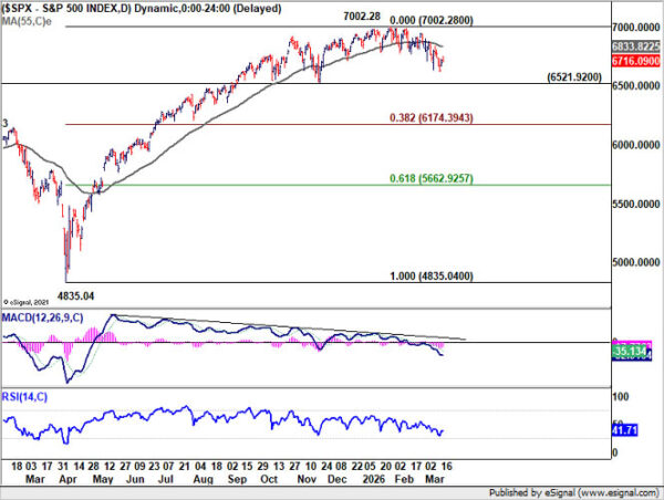 The key level to watch on the downside is 6,521.92. A firm break of this structural support would confirm that the index has formed a medium-term top at 7,002.28, on persistent bearish divergence in D MACD. S&P 500 should then be already in correction to the whole rise from 4835.04 (2025 low).