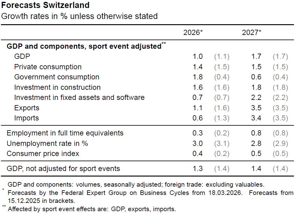 Switzerland’s economic outlook has been revised slightly lower as the fallout from the Middle East conflict continues to ripple through global markets. The Federal Government Expert Group on Business Cycles now expects GDP growth of 1.0% in 2026, down from the previous 1.1% forecast, reflecting below-average expansion. Growth is still projected to recover to 1.7% in 2027, but the near-term outlook has clearly softened amid rising uncertainty.