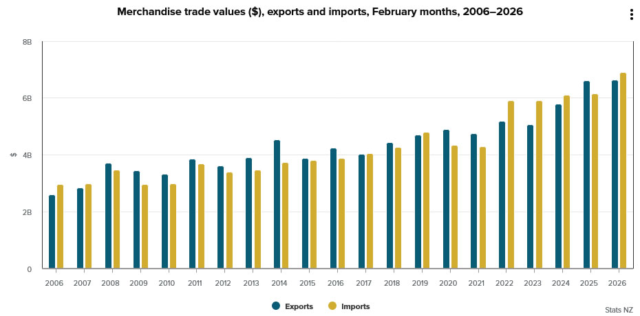 New Zealand’s trade balance reported a deficit of NZD -257m in February as imports surged far ahead of modest export gains. Goods exports edged up just 0.4% yoy to NZD 6.6B, while imports jumped 12% yoy to NZD 6.9B.