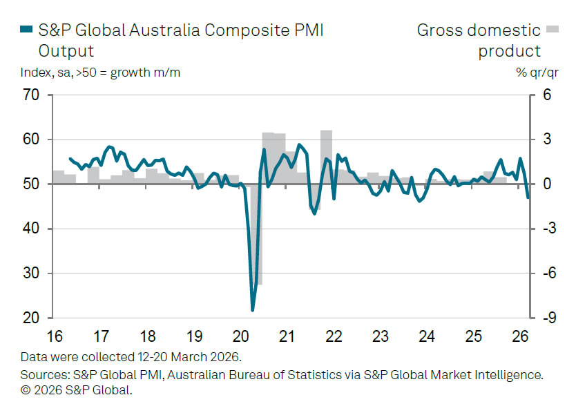 Dennison noted that the figures offer an early indication of how the Middle East conflict is feeding through to the global economy, with Australian firms facing rising costs, supply chain disruptions, and weakening demand—pointing to emerging stagflation dynamics.