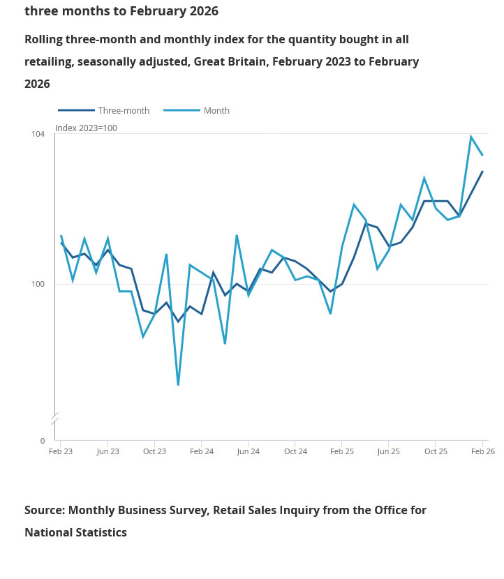 The decline was led by supermarkets, where sales volumes dropped back after January’s increase. Non-store retailers also reported weaker activity, reinforcing the view that demand was temporarily boosted rather than structurally improving.