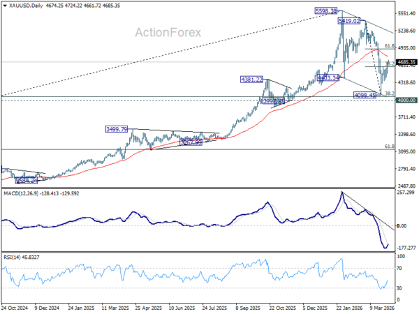 Sustained breack above 55 D EMA would strengthen the case that the correction from 5,419.02 peak has completed in three waves down to 4,098.45, after drawing support from the key 4,000 cluster suppoport. That will open the path back toward 5,419.02–5,598.38 resistance zone, with prospect of resuming the long term up trend towards the end of the year.