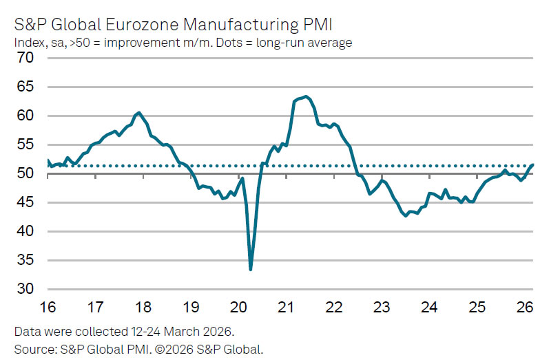 Eurozone PMI Manufacturing was finalized at 51.6 in March, up from 50.8, marking a 45-month high and signaling continued, albeit modest, expansion in the sector.
