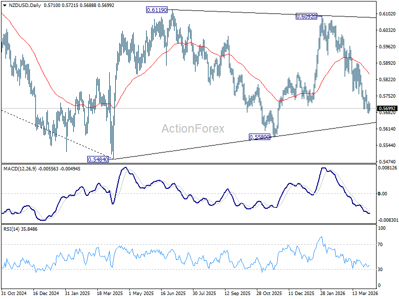 For the near term, risk will stay on the downside as long as 55 D EMA (now at 0.5843) holds in case of recovery. Any downside acceleration ahead, and break of 0.5580 support will argue that the long term down trend is ready to resume through 0.5484.