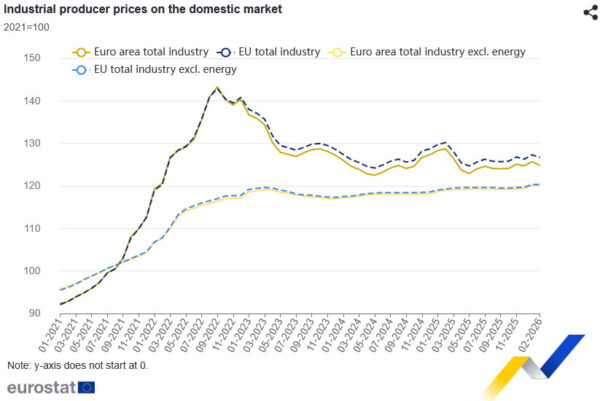Across the EU, producer prices fell -0.5% mom and -2.7% yoy, with notable declines in (-3.1%), Ireland (-2.6%) and Portugal (-1.8%). The highest increases were observed in Croatia (+3.8%), Finland (+2.7%) and Lithuania (+1.8%).