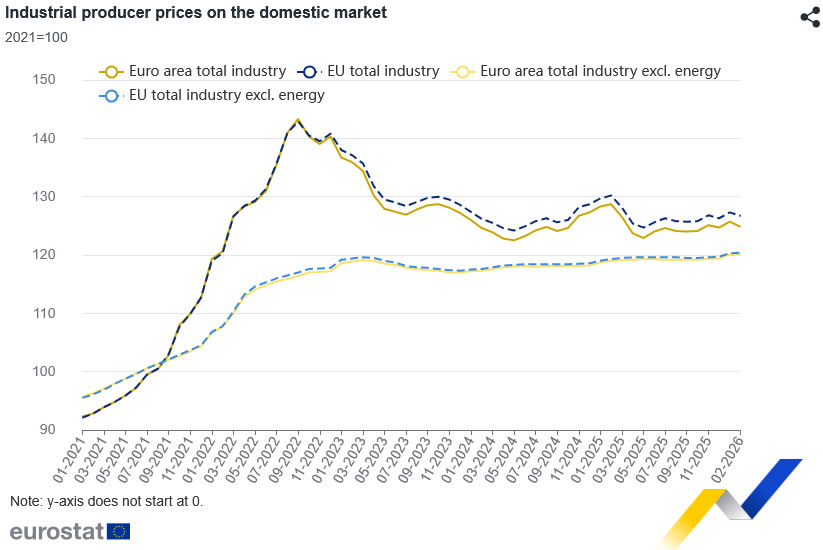 Eurozone PPI fell -0.7% mom and -3.0% yoy in February, in line with expectations, with the decline largely driven by a sharp drop in energy inflation before the Iran War.