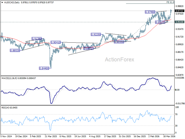 Technically, outlook in AUD/CAD will stay bullish as long as 0.9510 support holds, even in case of retreat. Next near term target is 61.8% projection of 0.9055 to 0.9749 from 0.9510 at 0.9939, or even further through parity.
