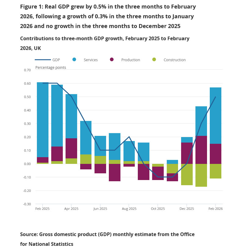 On a three-month basis, growth also improved. GDP expanded by 0.5% in the three months to February, up from 0.3% in the three months to January. Services output rose by 0.5%, while production led with a 1.2% increase, suggesting underlying momentum in the industrial sector.