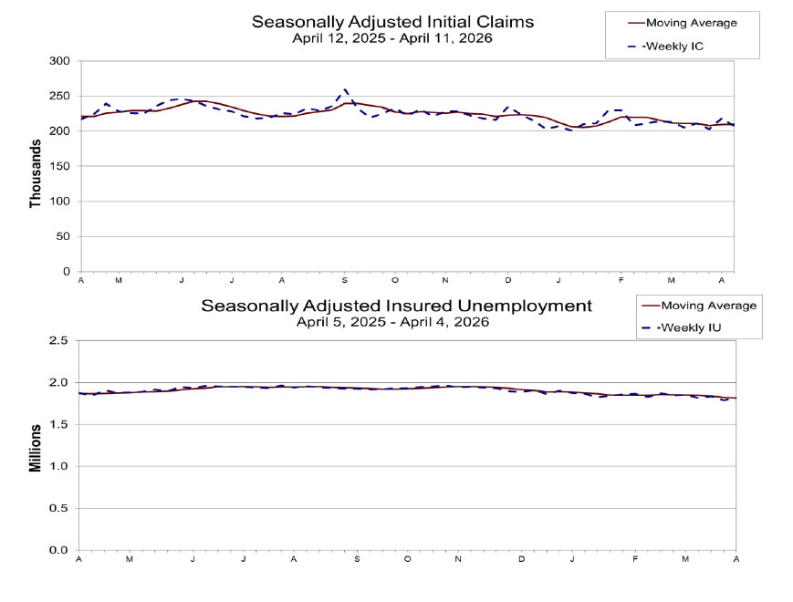 US initial jobless claims fell by -11k to 207k in the week ending April 10, coming in below expectations of 215k and signaling continued strength in the labor market. The 4-week moving average edged up slightly to 209,750, but remains consistent with a low level of layoffs overall.