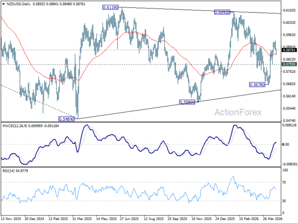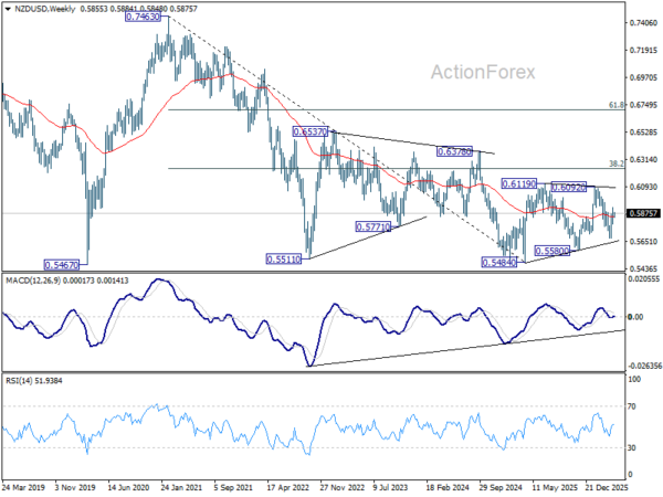On the downside, break of 0.5793 will bring deeper fall to 0.5678 support first. Further break there will argue that the down trend from 0.7463 (2021 high) is ready to resume through 0.5484 (2025 low).