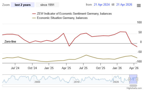 Germany’s economic sentiment deteriorated sharply in April, with the ZEW Economic Sentiment index plunging from -0.5 to -17.2, well below expectations of -6.7, and marking the lowest level since late 2022.The weakness is not limited to expectations. The Current Situation Index fell from -62.9 to -73.7, also undershooting forecasts of -69.5, signaling that the economy is already under pressure.