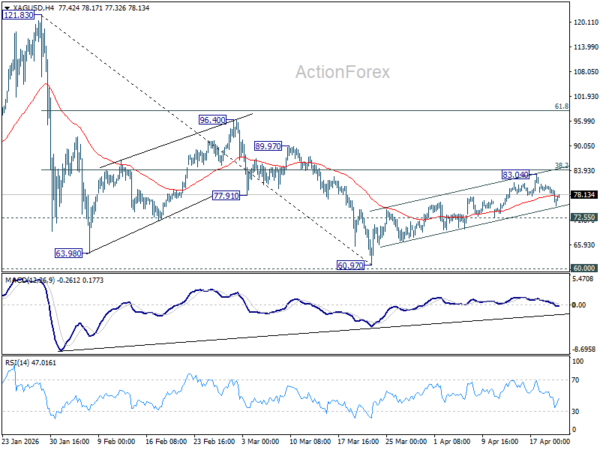 Silver, while still relatively resilient, is showing early signs of fatigue too. The metal remains within the near term rising channel, but momentum indicators are weakening. Resistance at 38.2% retracement of 121.83 to 60.97 at 84.21 is likely to limit further gains, at least on first attempt.