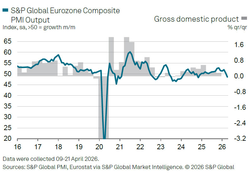 Eurozone business activity slipped back into contraction in April, with the Flash Composite PMI dropping from 50.7 to 48.6, a 17-month low. The downturn was driven primarily by a sharp deterioration in the services sector, where activity fell from 50.2 to 47.4, the weakest level in over five years.