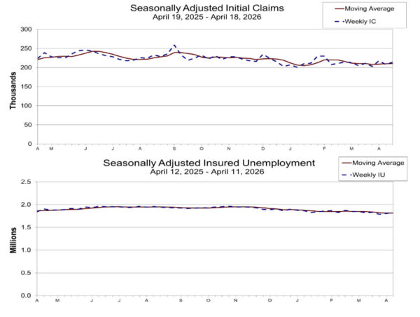 Continuing claims rose by 12k to 1.821M in the week ending April 11, suggesting a modest increase in the number of people staying on unemployment benefits. Four-week moving average of continuing claims rose 1k to 1.812M.