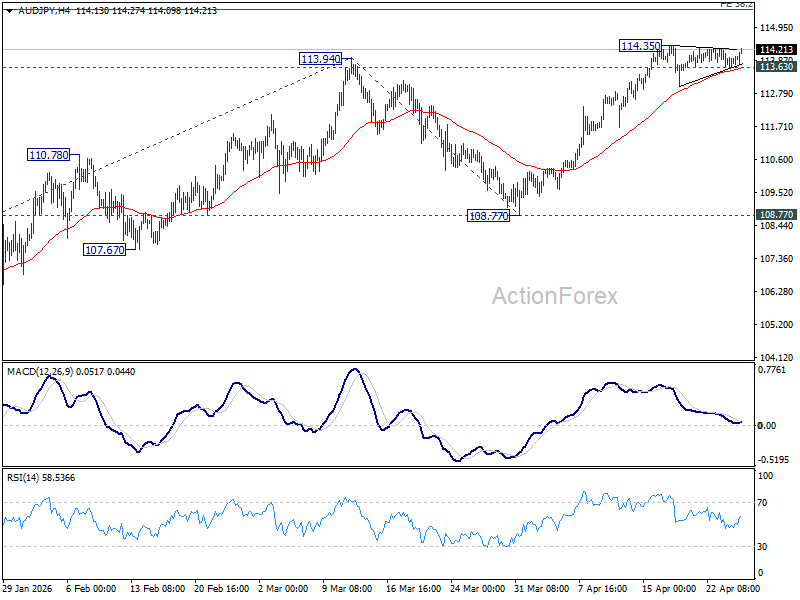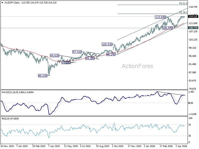 Technically, the setup is approaching a trigger point. AUD/JPY is testing 114.35 resistance, and a break would open the path toward 38.2% projection of 96.24 to 113.94 from 108.77 at 115.53 initially. Decisive break there would likely prompt upside acceleration to 61.8% projection at 119.70, which is close to 120 psychological level.