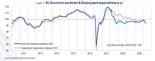 Economic sentiment in Europe weakened sharply in April, with the Economic Sentiment Indicator falling from 96.7 to 93.5 in the EU and from 96.2 to 93.0 in the Eurozone. The decline marks a clear deterioration in business and consumer confidence, pushing both readings well below the long-term average of 100.