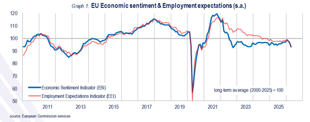The Employment Expectations Indicator also deteriorated significantly, falling from 97.2 to 93.2 in the EU and from 96.3 to 91.7 in the Eurozone, highlighting growing concerns over the labor market outlook.