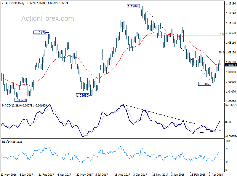Comparing the two, AUD/NZD is in recovery mode since early April. For now, the rise from 1.0486 is seen as a correction and could target 38.2% retracement of 1.1289 to 1.0486 at 1.0793. But we’ll start to look for topping signal around there.